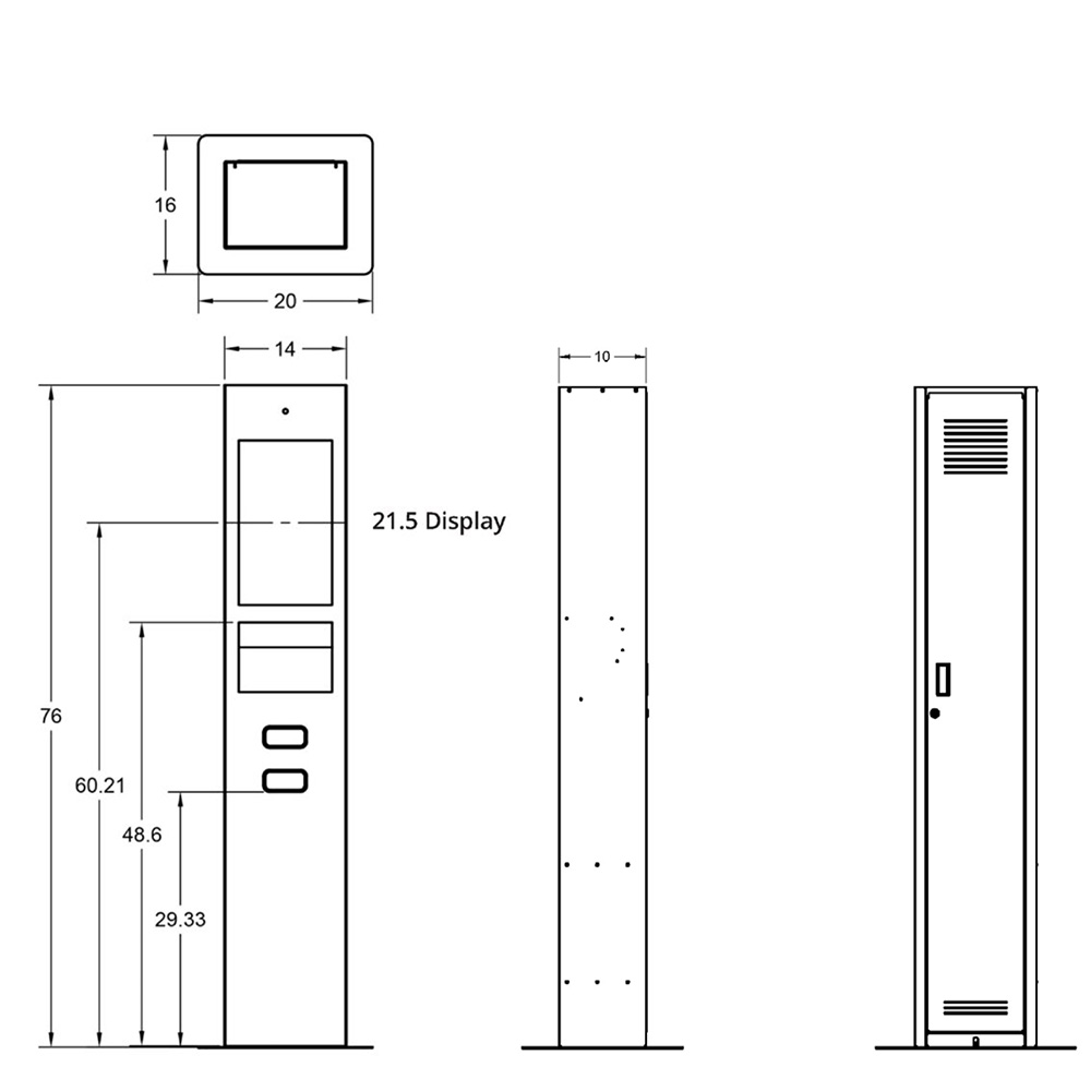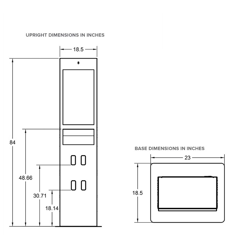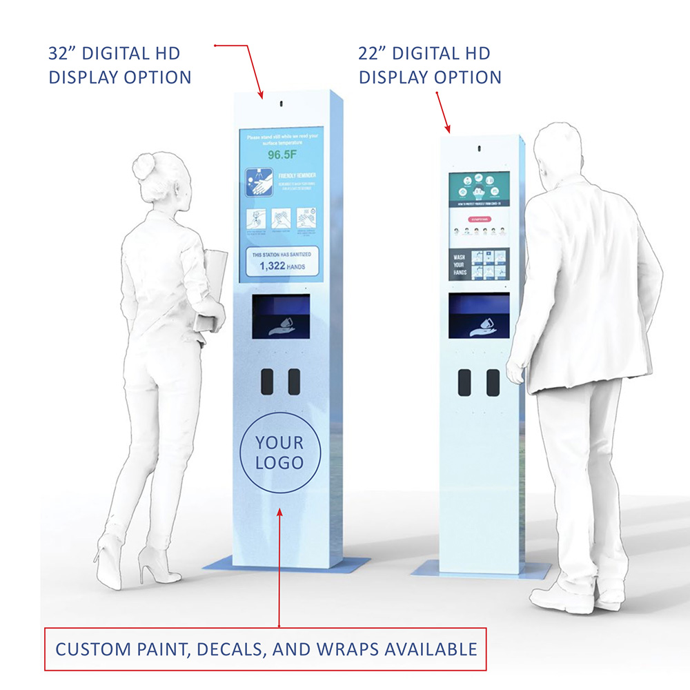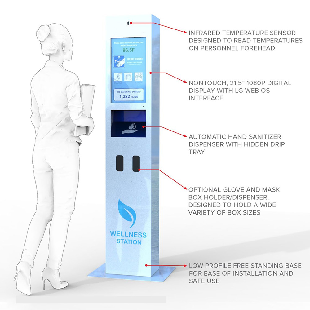 Constructed with 14 gauge metal, powder coated white. Integrated infrared temperature sensor to capture temperatures of individuals standing in front of the kiosk. Designed to hold 21”-22” display. Hand sanitizer dispenser with infrared sensor and pump. Cutouts with universal glove, mask, and PPE box holders.